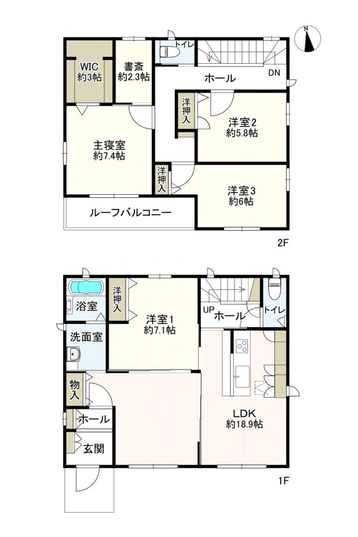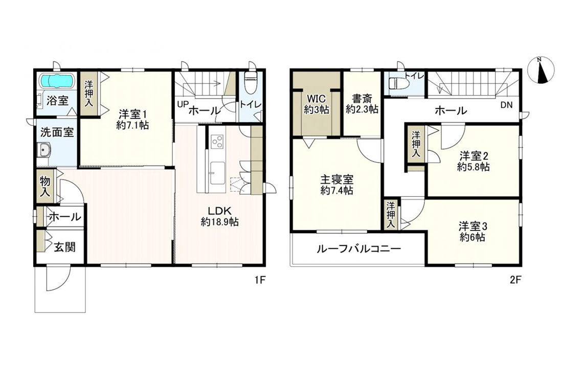 4LDK+書斎。テレワークに便利な書斎スペースやルーフバルコニー、各階のトイレなど。