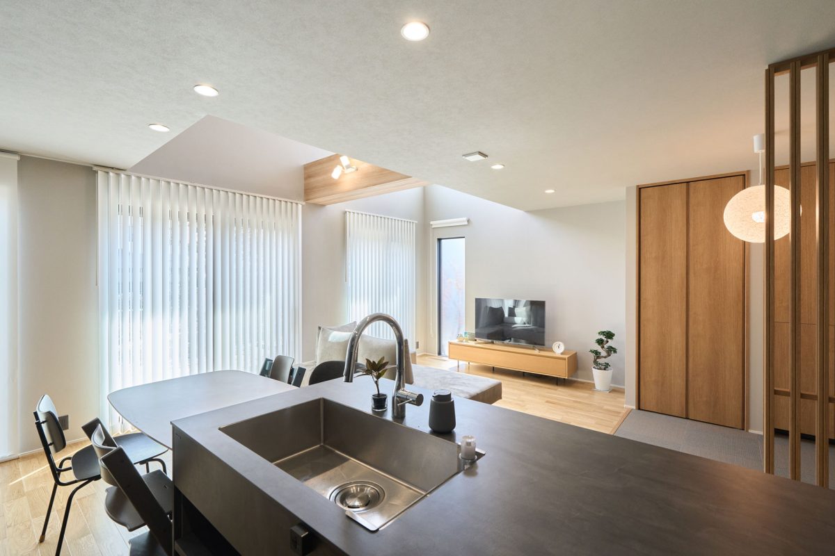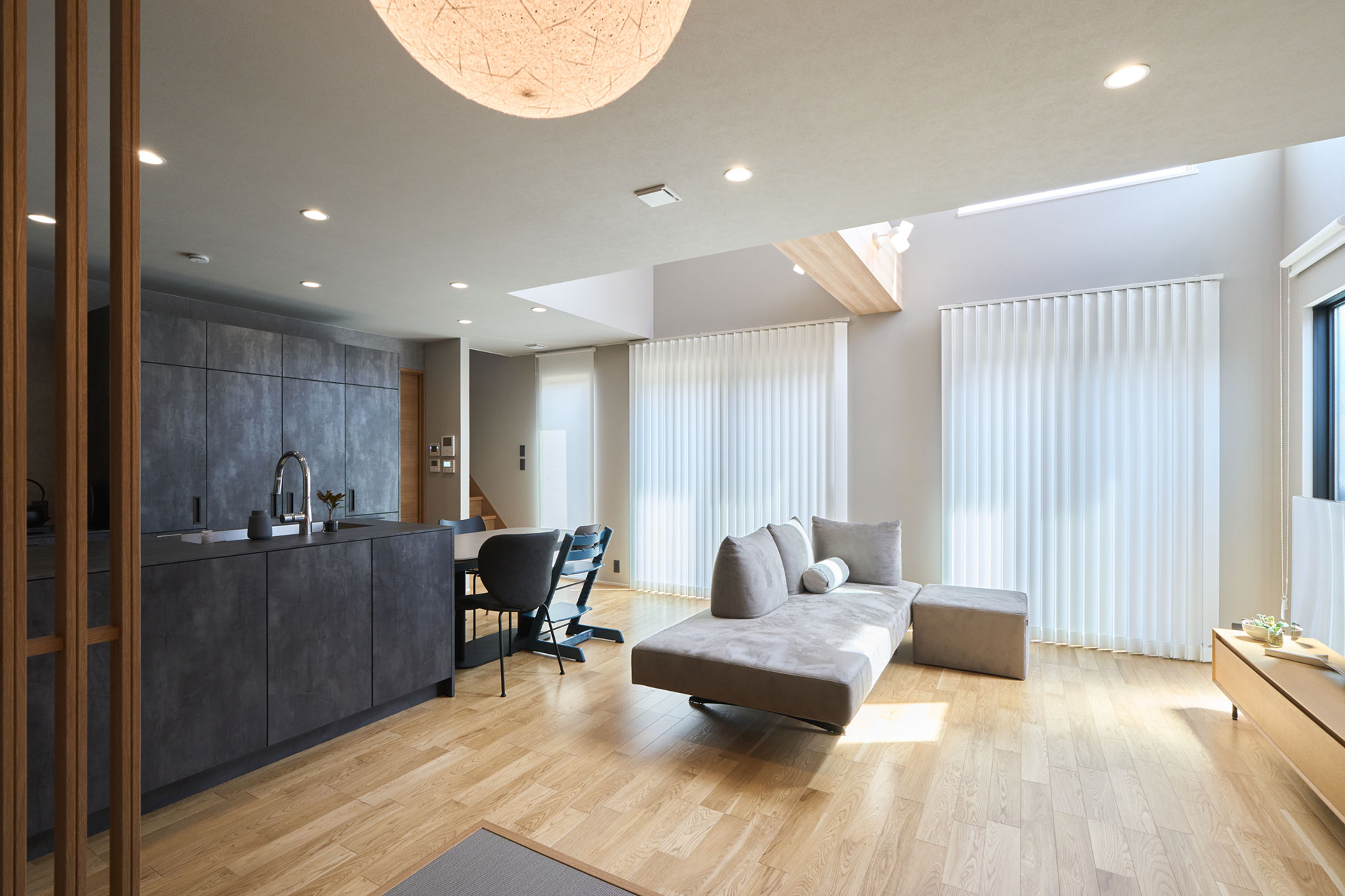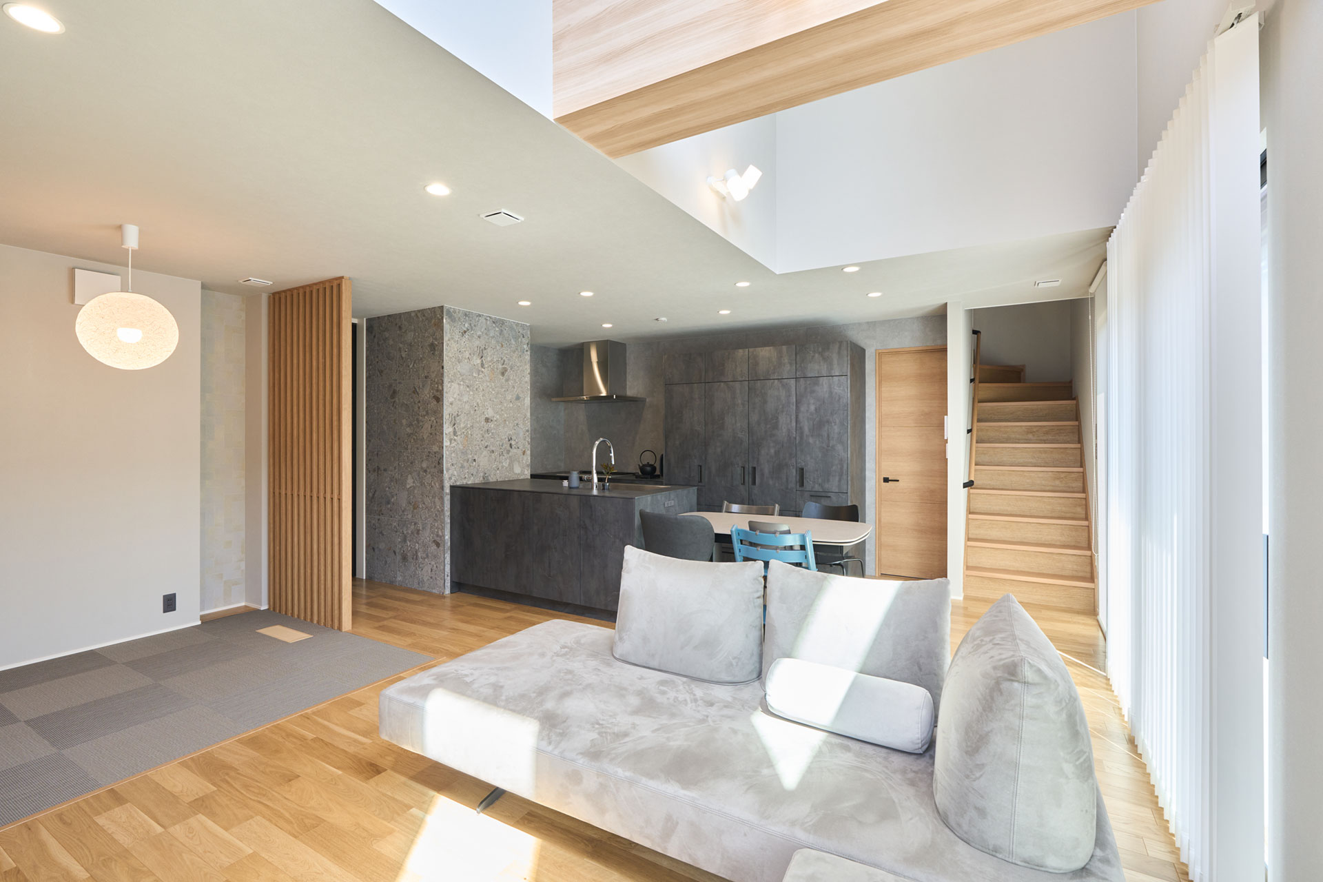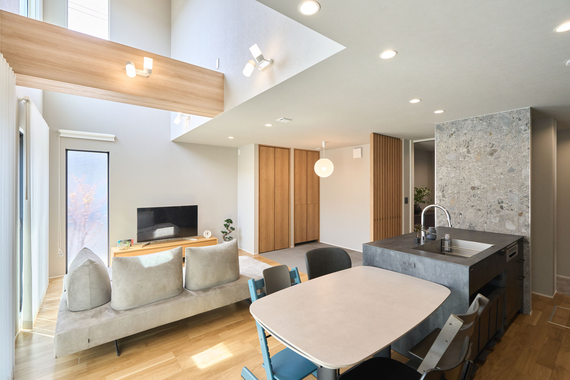 完成した住まいは、大きな吹き抜けが主役の開放的なリビング。全館空調の心地よさに包まれ、家族でゆったりと過ごす時間が日常に。生活感を抑えたキッチンも来客から好評で、思い描いていた“すっきりと整う暮らし”を実現されています。