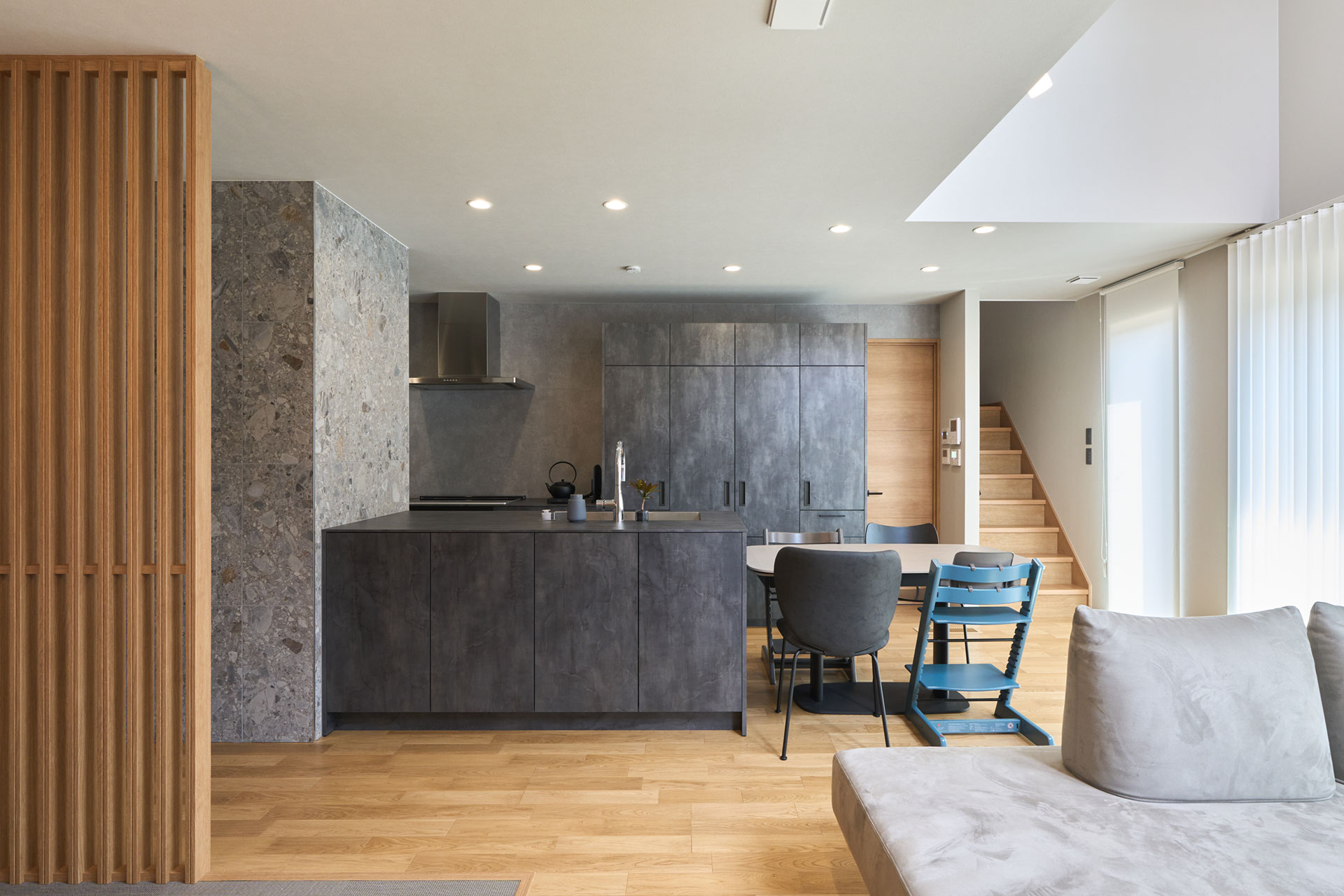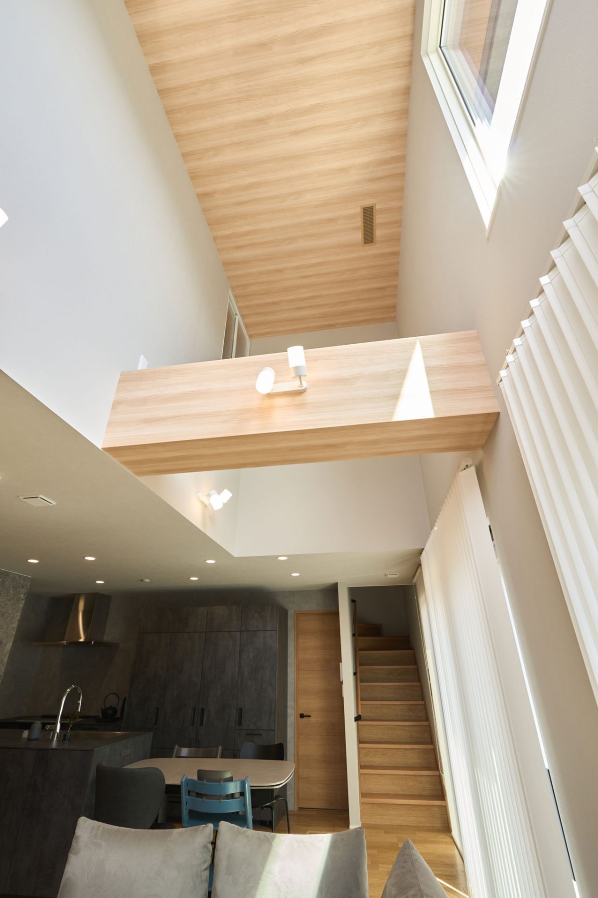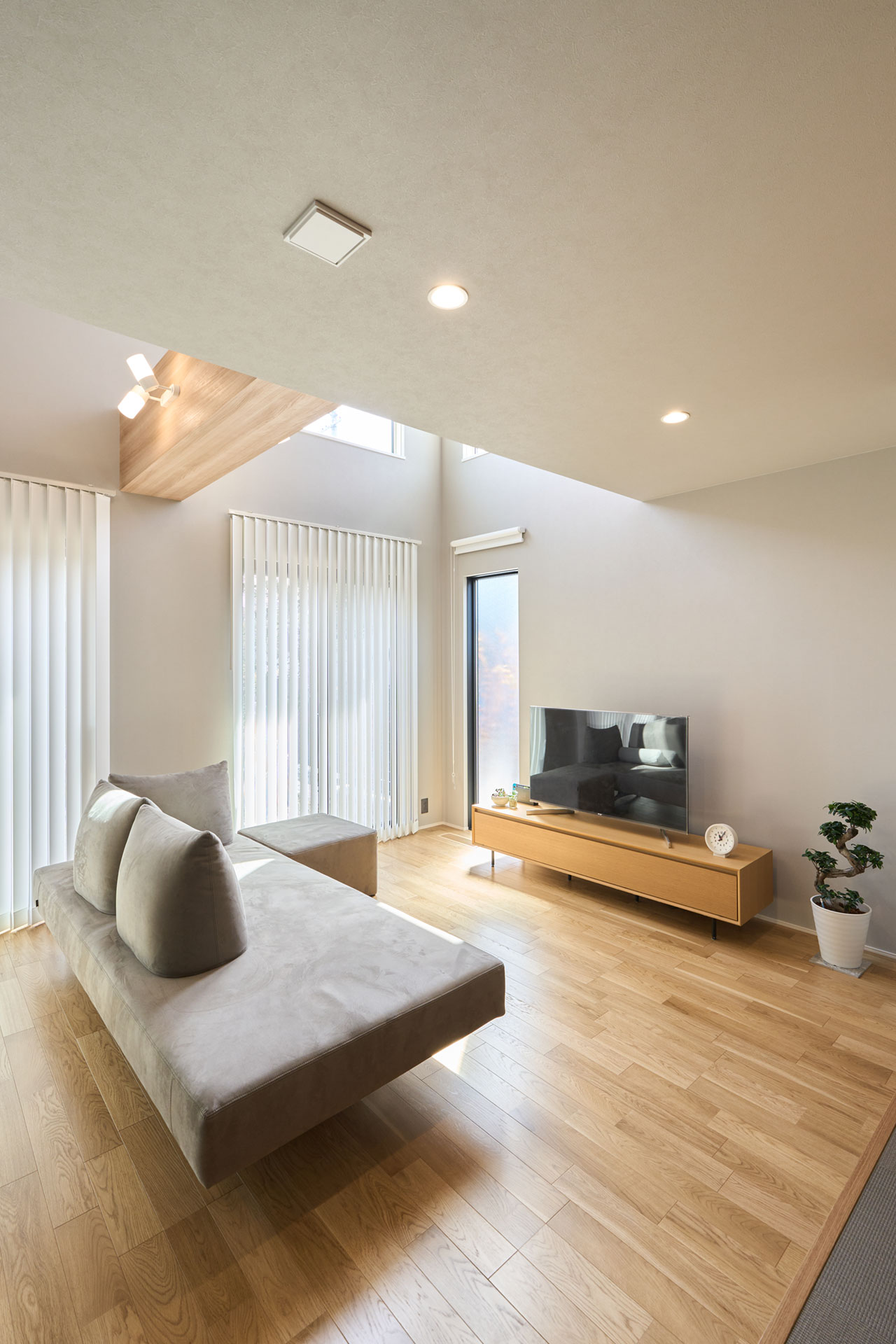 完成した住まいは、大きな吹き抜けが主役の開放的なリビング。全館空調の心地よさに包まれ、家族でゆったりと過ごす時間が日常に。生活感を抑えたキッチンも来客から好評で、思い描いていた“すっきりと整う暮らし”を実現されています。