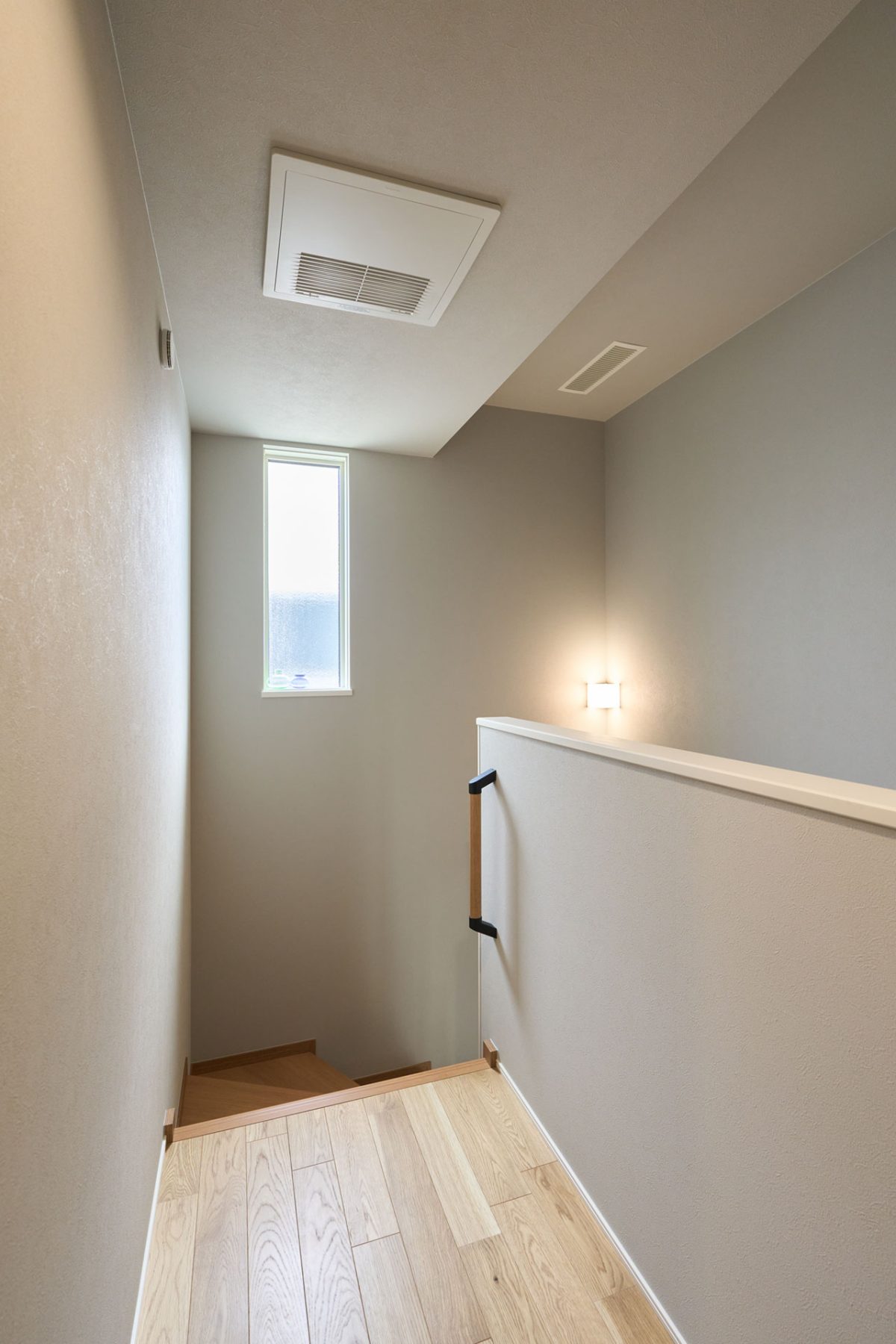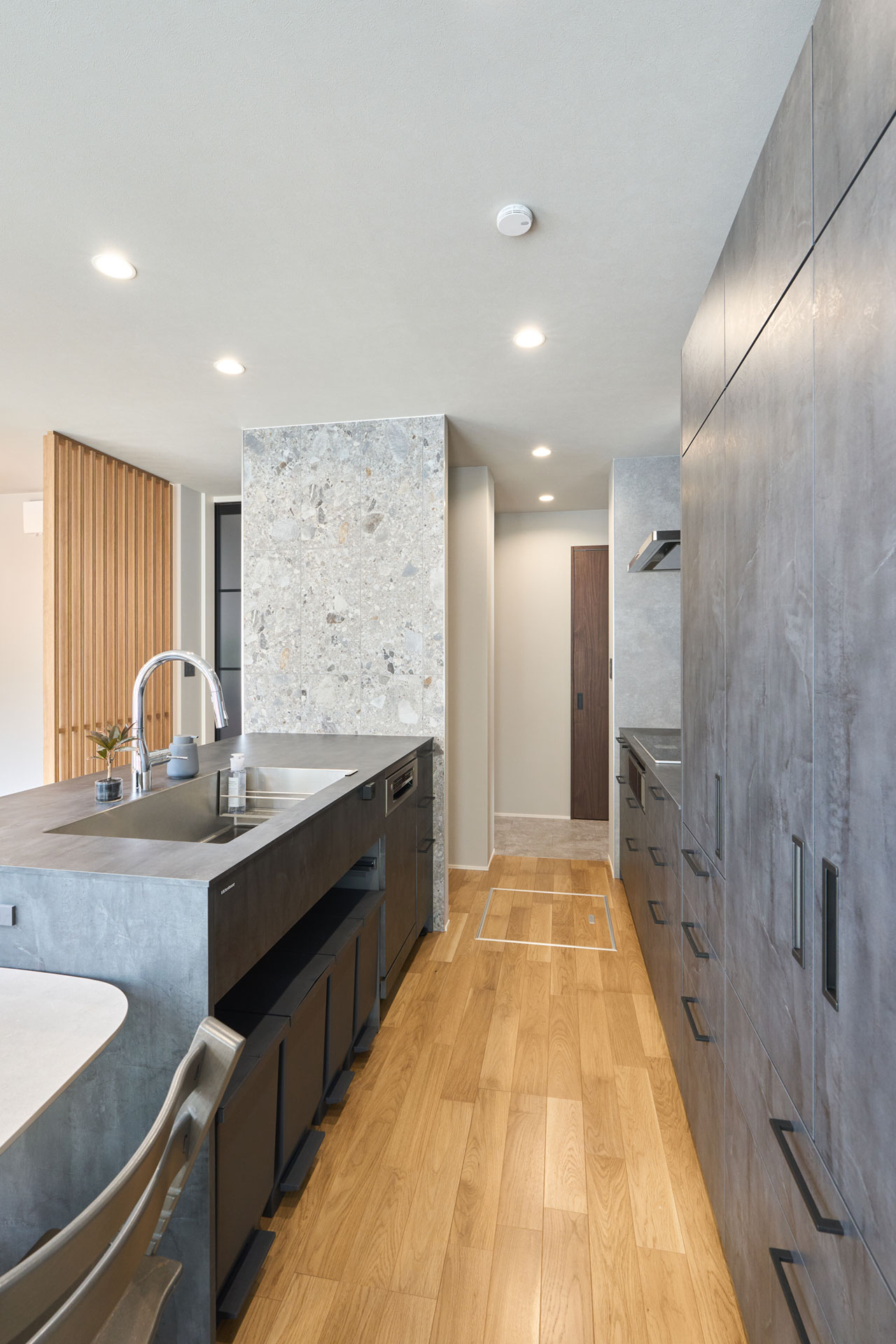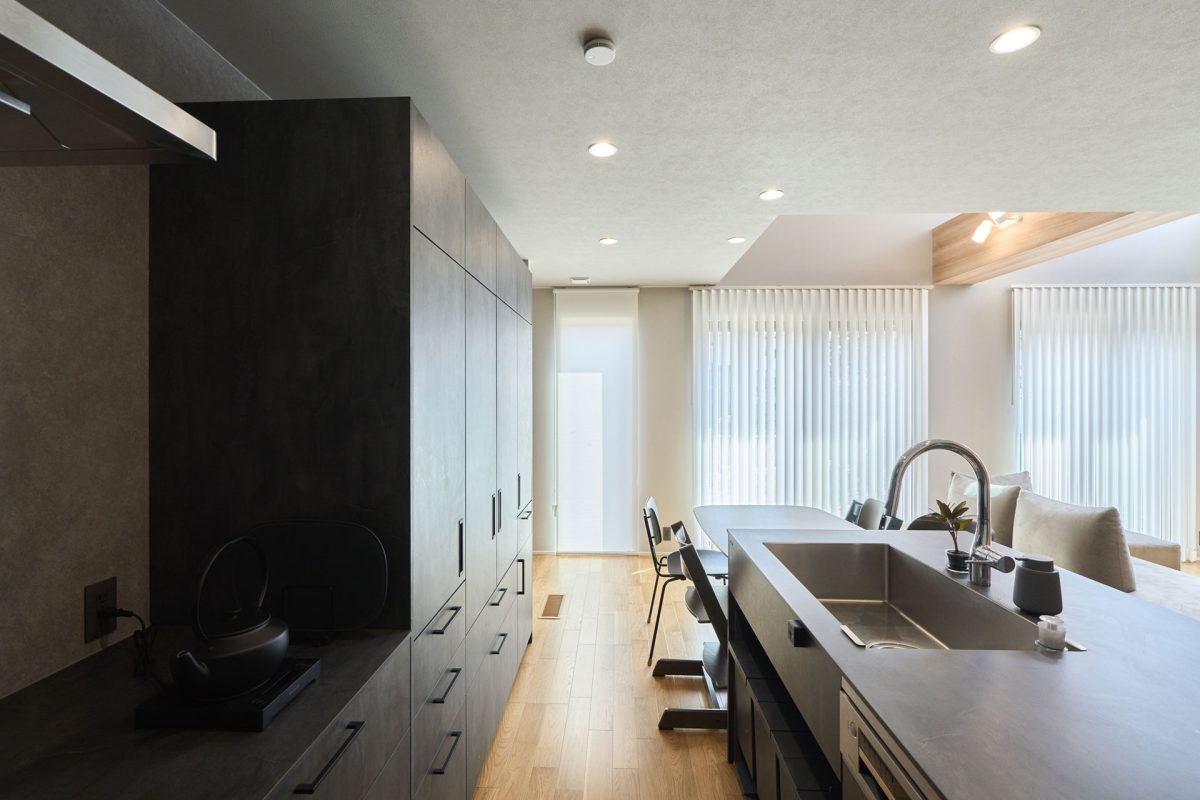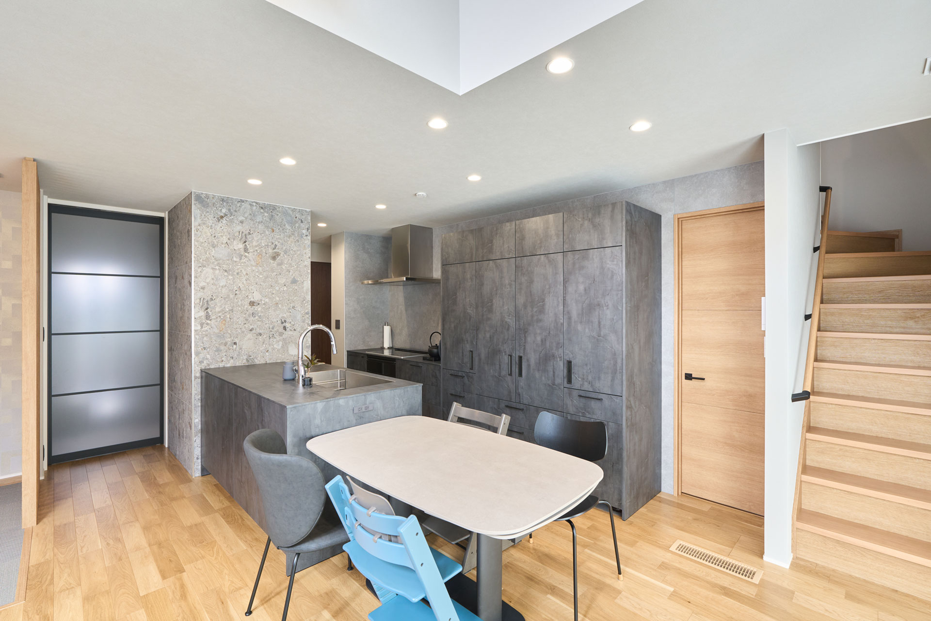 完成した住まいは、大きな吹き抜けが主役の開放的なリビング。全館空調の心地よさに包まれ、家族でゆったりと過ごす時間が日常に。生活感を抑えたキッチンも来客から好評で、思い描いていた“すっきりと整う暮らし”を実現されています。