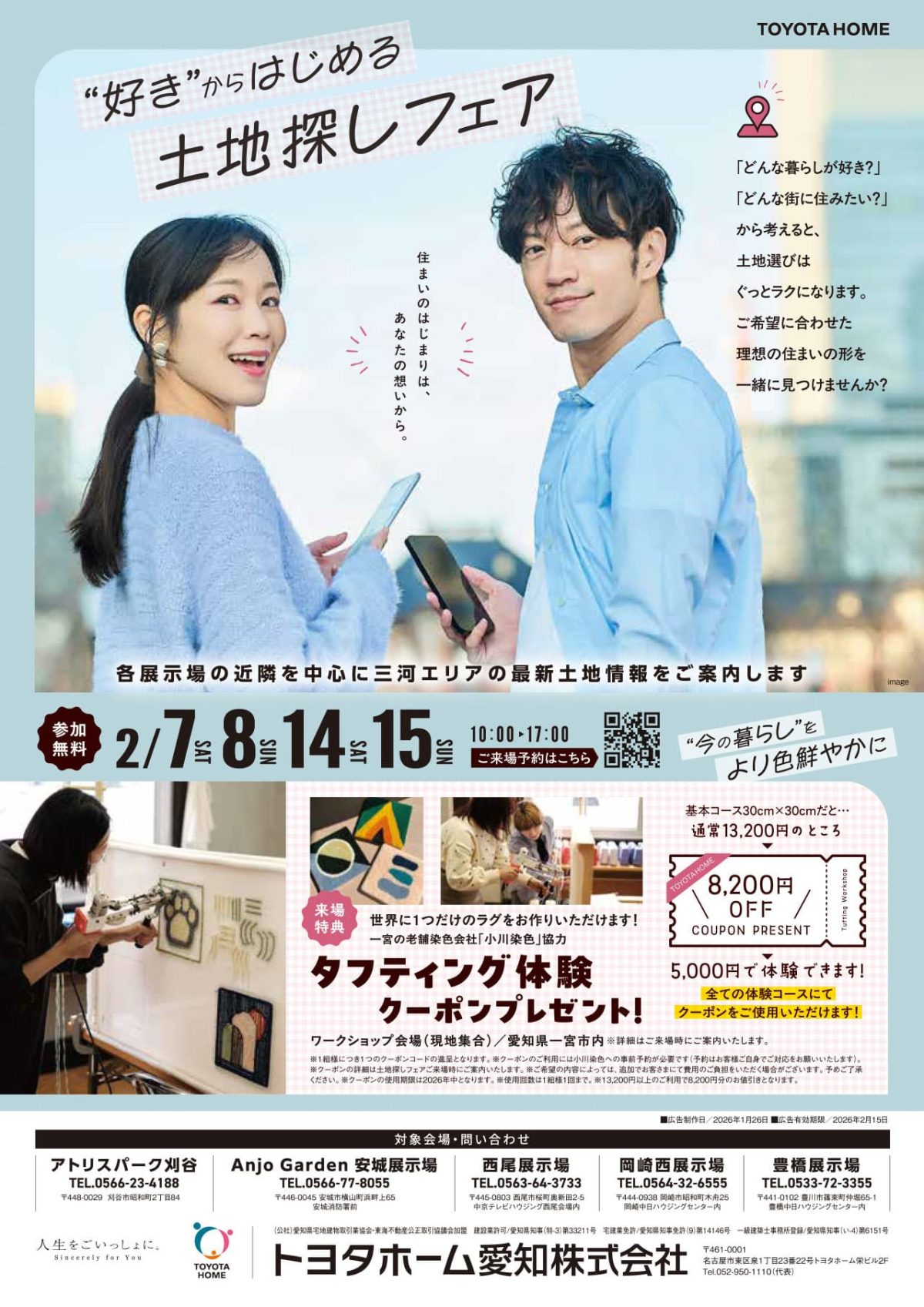 ※1組様につき1つのクーポンコードの進呈となります。※クーポンのご利用には小川染色への事前予約が必要です(予約はお客様ご自身でご対応をお願いいたします)。※クーポンの詳細は土地探しフェアご来場時にご案内いたします。※ご希望の内容によっては、追加でお客さまにて費用のご負担をいただく場合がございます。予めご了承ください。※クーポンの使用期限は2026年中となります。※使用回数は1組様1回まで。※13,200円以上のご利用で8,200円分のお値引きとなります。