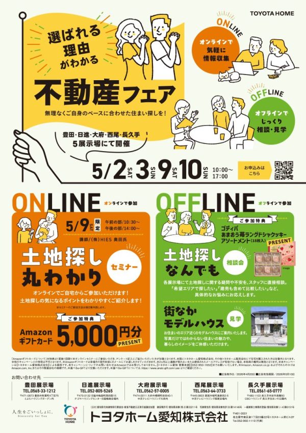 「Amazonギフトカードについて」※特典は1家族1回限り※オンラインセミナーにご参加いただき、アンケート記入にご協力いただいた方が対象となります。※既にトヨタホーム愛知株式会社、その他トヨタホーム販売会社にて住宅を購入された方は対象外となります。※他のキャンペーンとの併用は不可となります。※Amazonギフトカードは来場月の翌月末頃にEメールにてお渡しをさせていただきます。※2ヵ月以上連絡が取れないまたは提供されたメールアドレスが有効でない場合、本特典の権利は無効となります。※本キャンペーンは【トヨタホーム愛知株式会社】による提供です。本キャンペーンについてのお問い合わせはAmazonではお受けしておりません。【トヨタホーム愛知 営業本部】【052-950-1652】までお願いいたします。※Amazon、Amazon.co.jp およびそれらのロゴはAmazon.com, Inc.またはその関連会社の商標です。※選べるe-GIFTより交換いただけます。※選べるe-GIFTについては、https://www.anatc-gift.com/use/よりご確認ください。