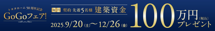 ■販売棟数/毎月、契約先着順5名様限定※各月契約棟数になり次第締め切りとさせていただきます。【エントリー資格】トヨタホーム愛知の施工エリアに建築可能な土地をお持ちの方(もしくは取得予定の方)で、【10月のご予約】2025年9月20日から10月末まで、【11月のご予約】2025年11月末まで、【12月のご予約】2025年12月末までに建築申込書での御意志確認、【10月のご予約】2025年11月末まで、【11月のご予約】2025年12月末まで、【12月のご予約】2026年1月末までにトヨタホーム愛知と建築工事及び外構工事請負契約を交わしていただくことが可能な方。尚、トヨタホーム愛知(株)の建売住宅をご購入のお客様は対象外となります。※敷地条件や法的制約、その他の理由で建築が不可能な場合、お申込みをお断りさせていただきます。※お申込みは1家族、1世帯、1敷地について1口のみで、建築されるご本人様に限ります。※他のキャンペーンとの併用はできません。※法人名義および、同業者の方、トヨタホーム店勤務の方のお申込みはご遠慮ください。